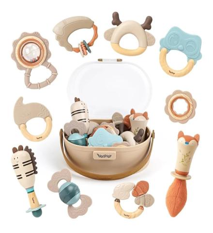 Jouet Dentition Bébé : jouet de dentition bébé avec 10 hochets de différentes formes. Livré avec une boîte de rangement. L'anneau de dentition en silicone de qualité alimentaire soulage les gencives enflées pendant la poussée dentaire.