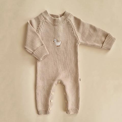 Weicher und bequemer gestrickter Baby-Spielanzug mit Holzknöpfen. Aus Bio-Baumwolle. Für Jungen und Mädchen. Farbe: Oatmeal. Kombinieren Sie es mit unseren anderen entzückenden Baby-Strickwaren für ein perfektes Set!