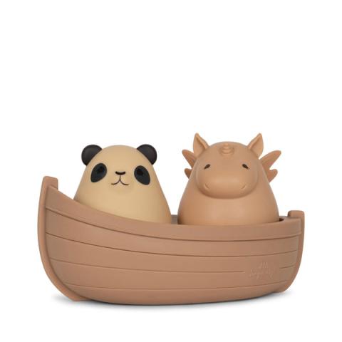Un set de jeux pour le bain composé de: - un petit panda. - une licorne. - un bateau. Les jeux ne sont pas percés afin de permettre un nettoyage facile et d'éviter les moisissures et bactéries à l'intérieur. L'heure du bain va devenir encore plus amusante. Matières: 100% silicone.