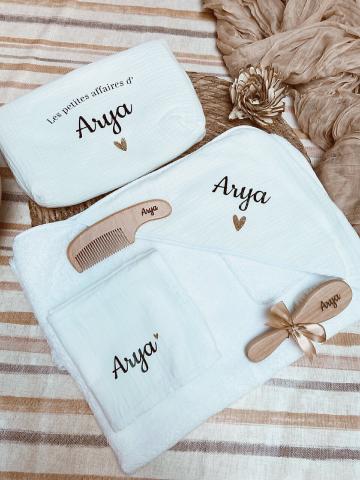 Une box de bain personnalisée avec le prénom de l'enfant. Composition : Une cape de bain 70x70cm en gaze de coton et en éponge Un gant de toilette en éponge Un peigne en bois Une brosse à poils doux en bois Une trousse de toilette (19 x 18 x 9cm) Un tetra 60x60 Personnalisation : thermocollant Une cape de bain 70x7