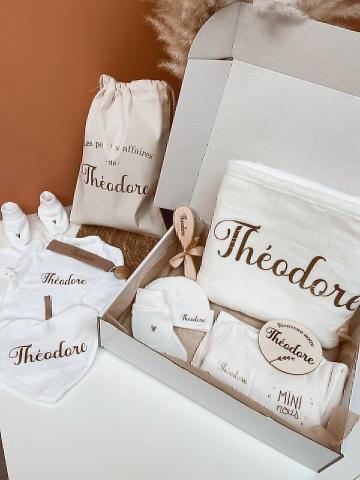 Une box naissance personnalisée avec le prénom de l'enfant Composition : Un pyjama en coton Un body Un bonnet (avec ou sans noeud) Une paire de gants Une paire de chaussons Un déco en forme de coeur Une brosse à poils fins gravées Une attache tétine beige Une plaque en bois gravée Un plaid en polaire (100x80cm) Un poch
