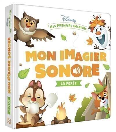 Mon imagier sonore De vrais sons pour éveiller les tout-petits ! Découvre la forêt avec tes héros Disney préférés !Observe choque scène et nomme les éléments. puis presse les puces sonores pour écouter les bruits du ? qui fentoure.