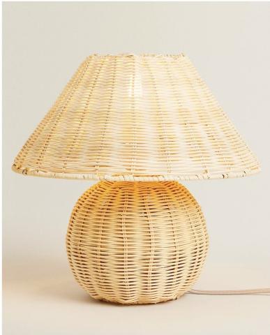 Lampe de table pour enfant en rotin tressé sur la base et sur l’abat-jour.