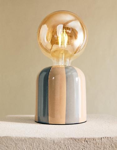 Lampe de table pour enfant avec base en céramique à rayures et ampoule à filaments incluse. Ampoule : 2 W G125 LEDCâble : 1,8 mètreSi le fil extérieur ou le câble de la lampe est endommagé, il devra être remplacé exclusivement par une personne qualifiée afin d’éviter tout risque.