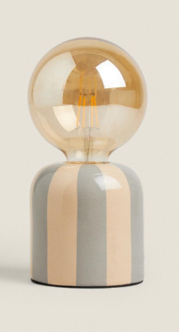 Lampe de table pour enfant avec base en céramique à rayures et ampoule à filaments incluse.
