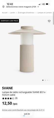 Ce produit est extrait d'une liste de cadeaux (Anniversaire, Noël, ...) déposée sur Kadolog. Kadolog permet de créer des listes de cadeaux (Anniversaire, Noël, ...) en toute liberté. Il est possible d'ajouter toutes vos envies cadeaux et de recevoir les dons directement sur votre compte. Avec les dons reçus, vous êtes alors libre d'aller acheter vos produits (comme ce 'Lampe de table rechargeable SVANE Ø21xH25cm sable | JYSK ') où et quand vous le souhaitez.