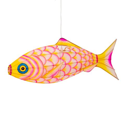 Lampion carpe jaune en bambou et soie, 70 cm. Écailles trompe-l'œil, léger et élégant. À récupérer en boutique. Câble inclus.