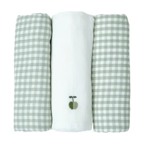 Langes bébé vichy vert en coton bio et certifiés OEKO-TEX. Lot de 3. Broderie pomme. Format 60x60 cm, doux et pratique pour le quotidien. Fabriqués au Portugal