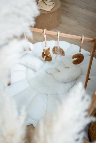 Fait main, vous pourrez l'utiliser comme simple tapis de jeu, transformer en espace de lecture avec quelques coussins autour d'un tipi, en piscine à balles, en sac de rangement pour jouets ou comme nid bébé en redressant les rebords à l'aide de rubans réglables cachés dans une petite poche