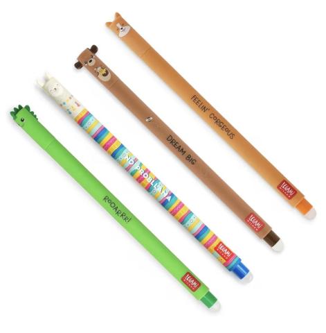 LEGAMI - Set of 4 erasable gel pens, Dino, Teddy Bear, Corgi, Llama, ball on the ends for removing ink, black, blue, green, red, thermosensitive, tip diameter 0.7 mm : Amazon.fr: Office Products