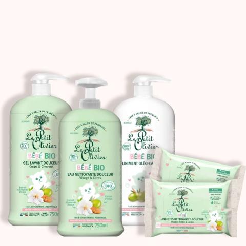 Un Assortiment d'Essentiels pour la Toilette de Bébé Des produits utilisables dès la naissance, comprenant au minimum 97% d'ingrédients d'origine naturelle, testés sous contrôle pédiatrique et originaires de Salon de Provence. !