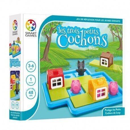 Placerez-vous correctement les maisons afin qu’ils puissent jouer à l’extérieur ? Et si jamais le loup apparaît, saurez-vous les aider en les protégeant à l’intérieur des maisons ? « Les Trois Petits Cochons » est un jeu de réflexion idéal pour les jeunes enfants. Vous y trouverez 3 grosses pièces de jeu juchées de maisons ainsi que 4 figurines (les cochons et le loup) faciles à manipuler. Les enfants adoreront voir les cochons regarder à travers les fenêtres de leur maison. Vous trouverez également un livre de conte illustré ainsi qu’un livret de 48 défis.