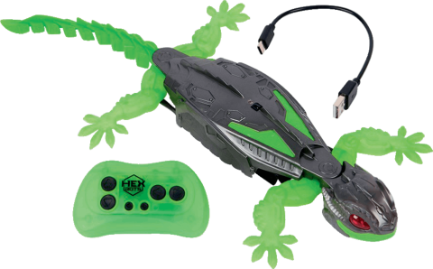 Lézard radiocommandé qui rampe au sol et grimpe sur les murs, avec yeux lumineux et télécommande. Recharge USB incluse.