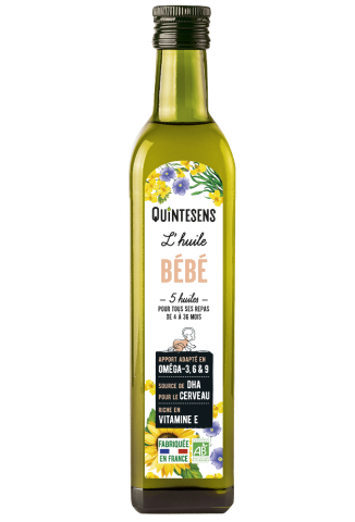 Pour les repas de Bébé dès 4 mois, découvrez le mélange d'huiles végétales bio Quintesens, pour un apport adapté en DHA et Oméga 3.