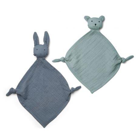 Liewood - Les doudous Yoko - Blue mix de Liewood deviendront très vite inséparables de votre bébé : un lapin bleu foncé aux longues oreilles et un ourson bleu clair irrésistible. Votre bébé pourra mordiller les 2 petits nœuds aux extrémités pour soulager la douleur lors des poussées dentaires. Conçus en coton bio, ces doudous super doux adorent les câlins.