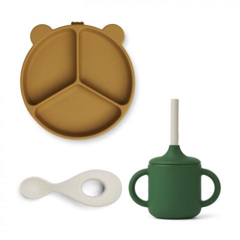 Ce set se compose d'une assiette à compartiments à ventouse, idéale pour laisser à bébé le soin de découvrir les différentes saveurs et textures, une cuillère ergonomique ainsi qu'une tasse d'apprentissage à paille intégrée.