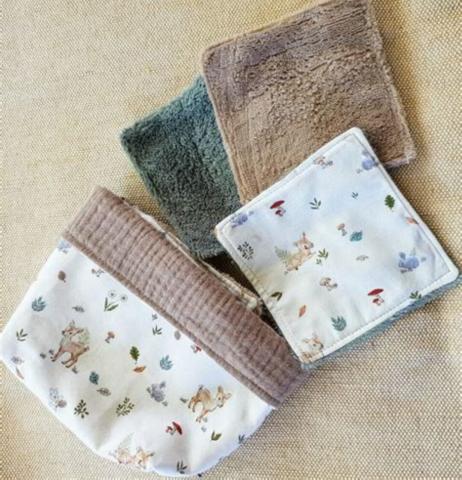 Pour le change et la toilette de bébé mais aussi pour le respect de la planète, plusieurs lots de lingettes lavables. Si possible de création artisanale pour encourager les petits producteurs, mais libre à vous de choisir (ou de les coudre vous même selon vos capacités). Le prix et la photo ne sont qu'une indication.