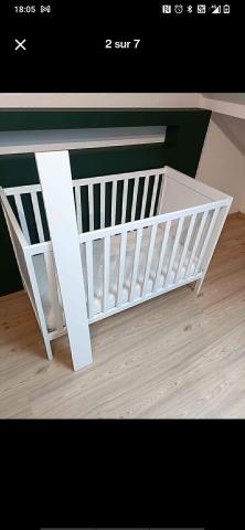 Lit bébé Ikea Sundvik blanc avec matelas housse protectrice de matelas et couette.