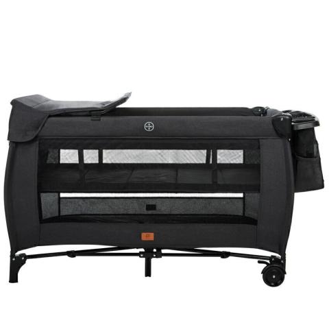 Très polyvalent, il est équipé d'un fond rehaussable pour un accès facile à bébé sans trop se pencher, d’un plan à langer amovible pour le change et enfin de paniers de rangement pour avoir à portée de main tous les essentiels de bébé.