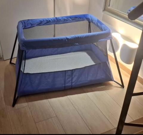 Un lit parapluie en parfait état, déjà rodé à plusieurs nuits, siestes et probablement quelques crises existentielles 😄!