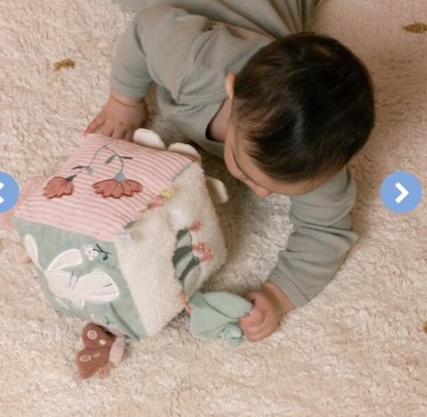 Vogel, konijn, vlinder... Je baby ontdekt alle dieren uit de bloeiende tuinen van Little Dutch met deze zachte speelkubus!