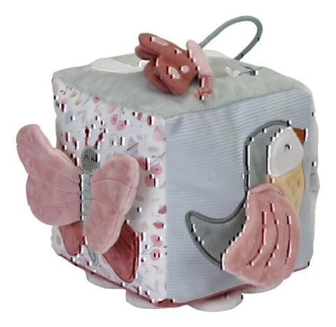 Vogel, konijn, vlinder... Je baby ontdekt alle dieren uit de bloeiende tuinen van Little Dutch met deze zachte speelkubus!