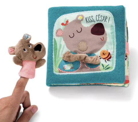 Bébé César se met au lit et embrasse tous ses amis. La marionnette à doigt s’en va câliner Albert, Georges et Alice… avant de dire ‘bonne nuit !’ à maman et d’aller se coucher dans son hamac ! Personnalise la dernière page avec ta photo pour faire dodo avec lui. Faites de doux rêves…