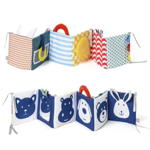 Une fois déplié, ce livre d’éveil double face accompagne bébé partout et à chaque étape de son développement ! Le livre peut se tenir à la verticale pour qu'il le découvre en position ventrale. La première face lui présente la grande famille des personnages Oxybul : Diana, Axel, Léandre, Max, Damien ainsi qu’un miroir. Les contrastes bleu et blanc stimulent sa vue et ses sens. Lorsqu'il grandit et qu’on retourne ce livre d’éveil, les découvertes se poursuivent avec des couleurs plus vives, des tissus texturés et des formes à toucher pour qu'il développe sa motricité fine. Il y a même une pochette transparente pour insérer une photo de son choix et rendre son livre d’éveil encore plus unique ! Quand il arrive à se tenir assis, votre bébé découvre le plaisir de le manipuler comme un livre classique. À chaque page, le papier bruissant récompense son geste et l’encourage à aller plus loin dans ses découvertes !