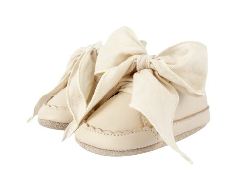 Doux petits pas ! Les chaussures les plus mignonnes et les plus confortables pour les premiers pas de votre petite fille. Ils sont fabriqués à partir du cuir de première qualité le plus doux et finis avec de petits bords ondulés. Un bel arc en mousseline donne une touche finale élégante. -100 % cuir de vache de qualité supérieure -Lacets -Semelle extérieure en caoutchouc