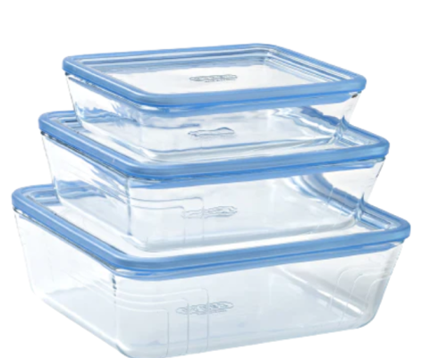 Lot de 3 boites de conservation en verre pyrex, de capacités 0,8L, 1,5L et 2,6L avec couvercles