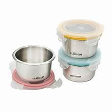 Set de 3 boîtes de conservation en inox rondes, légères et pratiques. Hermétiques, elles permettent de conserver, transporter, cuire et faire réchauffer vos petits plats. Compatibles micro-ondes. Contenance : 3 x 20cl.