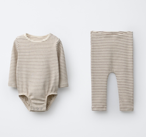 Lot de deux pièces. Body à col rond et manches longues. Fermeture à boutons-pression à l'épaule et en bas. Legging à taille élastique. Imprimé rayures. Tissu avec 95 % coton.