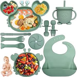 Kinyoda Lot de 10 accessoires de sevrage en silicone pour tout-petits avec ventouse, bavoir, cuillère, fourchette et gobelet, vaisselle pour bébé, cadeaux pour bébé (vert)