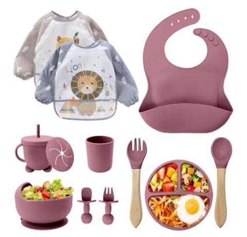 Lot de 12 couverts pour bébé - Cuillères pour bébé - Gobelets d'apprentissage - Bavoir en silicone - Assiette pour bébé avec ventouse - Couverts LED pour bébé - Sans BPA - Passe au lave-vaisselle