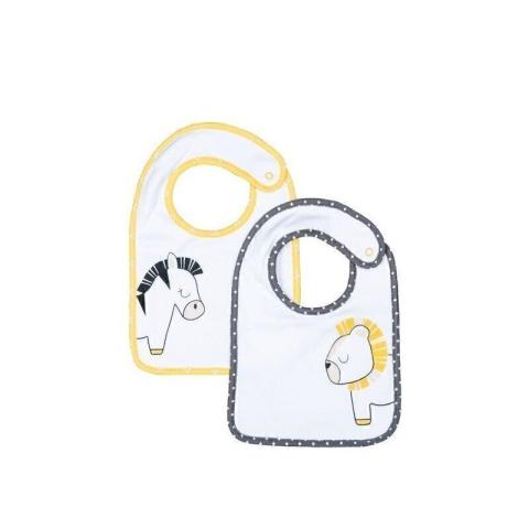 Pour les premiers repas de bébé, deux bavoirs en jersey : un bavoir blanc avec biais jaune et sérigraphie le Zèbre Pompon, et un bavoir blanc avec biais contrasté gris et le Lion Pluche .
