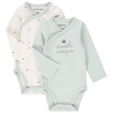 Lot de 2 bodies manches longues unis. Imprimé étoiles all-over. Ouverture pressionnée croisée de 1 à 6 mois. Entrejambe pressionnée. En coton issu de l'agriculture biologique.