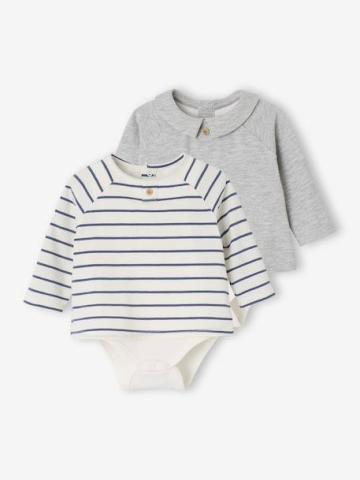 Si pratiques, ces 2 bodies 2 en 1 permettent d'habiller bébé en un seul geste ! Un body version polo uni, un body version tunisien rayé