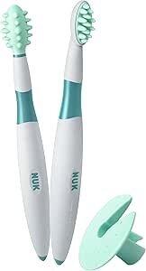 INITIATION PROGRESSIVE AU BROSSAGE : composé d’une brosse à picots arrondis et d’une brosse à picots coniques NUK, ce kit éducatif d’hygiène dentaire initie progressivement votre tout-petit au brossage des dents