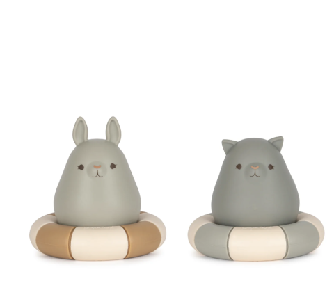 Jouets de bain, anneaux de bain avec un petit lapin et un chatDisponible en lot de 2, choix entre packs de deux couleurs.En 100 % silicone Certifié CE selon la norme européenne EN-71-1Convient à partir de 0 anInstructions de nettoyage :laver à l’eau chaude savonneuse (max. 30 °C).Ne pas utiliser de produits chimiquesAV