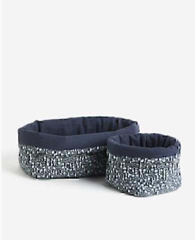 Paniers de rangement matelassés en toile de coton de tailles variées. Modèle avec bord rabattable. Hauteur 12 cm. Largeur 14 cm. Longueur : petit panier 14 cm, grand panier 28 cm.