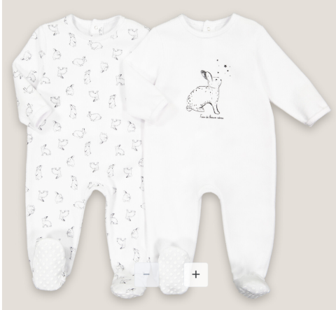• Lot de 2 pyjamas : 1 imprimé "lapins" + 1 uni avec motif "lapin" imprimé devant