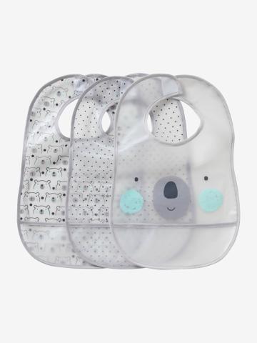 Lot de 3 bavoirs plastifiés avec récupérateur assortis ours - Quand bébé commence à vouloir manger seul, mieux vaut être bien équipé ! Grâce à ces bavoirs plastifiés avec poche récupératrice, s'il y a un loupé, les aliment
