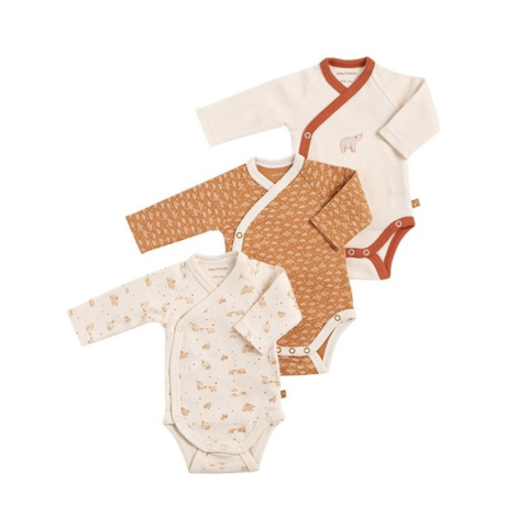 Leur forme croisée est très pratique et recommandée jusqu'au trois mois de l'enfant afin de faciliter l'habillage et le déshabillage. Les motifs de la collection Orsino, aux traits fins, tendres et délicats, viennent joliment décorer les bodies de bébé.