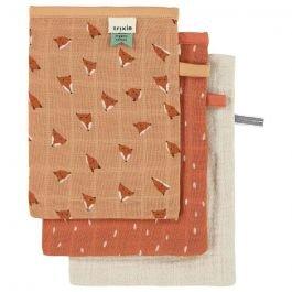 Assortiment de 3 gants de toilette en mousseline douce.