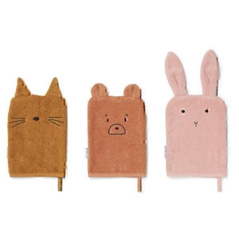 GANTS DE TOILETTES ENFANT - LOT DE 3Quelle meilleure façon d'attirer un enfant réticent dans le bain qu'avec une poupée parlante en forme de gant de toilette ? La multifonctionnalité de Sylvester vous permet de vous laver, de divertir et de jouer avec votre enfant. Composition: 100% coton éponge biologique Lot de 3