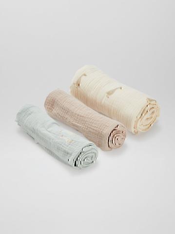 Découvrez notre lot de 3 langes en gaze de coton, l'essentiel douceur pour bébé ! Idéaux pour envelopper votre tout-petit de tendresse.- Lot de 3 langes - En gaze de coton - 2 langes de 60 x 60 cm environ - 1 lange de 100 x 120 cm environ - 1 lange uni - 2 à motifs