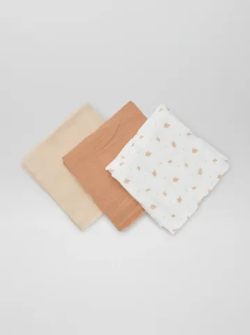 Un joli lot de 3 langes en coton pour bébé. - Lot de 3 langes- 100% coton - 1 lange avec motifs 'Safari' all over - 2 langes unis - Dimensions : 60 x 60 cm