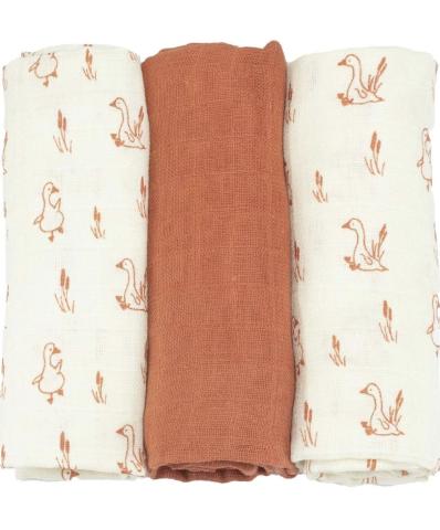 Trois Kilos Sept - Lot de 3 Langes bébé - Carrés de Mousseline Coton 70x70cm - Multi-usages: Couverture, Doudou, Bavoir, Protection Solaire - Certificié OEKO-TEX® STANDARD 100 - Motif Oie - Terracotta