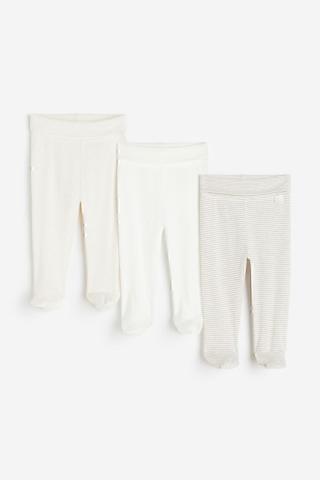 Pantalons en jersey souple de coton avec large bande rapportée repliable à la taille. Pieds fermés avec élastique sur le talon.