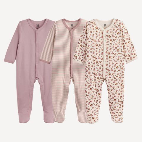 Détails produit •  Col V •  Manches longues •  Motif imprimé léopard sur 1 pyjama + 1 pyjama rayé + 1 pyjama uni •  Ouverture devant pressionnée •  Fermeture entrejambe : pressionnée •  Pieds antidérapants •  Saisonnalité : mi-saison •  Lot de 3 •  Coton •  Coton recyclé au minimum à 20%Composition et Entretien •  100% coton •  Coton recyclé au minimum à 20% •  Température de lavage 30° cycle délicat •  Séchage en tambour faible •  Pas de nettoyage à sec •  COTON RECYCLÉ. Utiliser du coton recyclé, c'est préserver certaines ressources et réduire les déchets. •  OEKO-TEX® Standard 100. La certification OEKO-TEX® Standard 100 contrôle les substances nocives des produits textiles via un label indépendant et international.